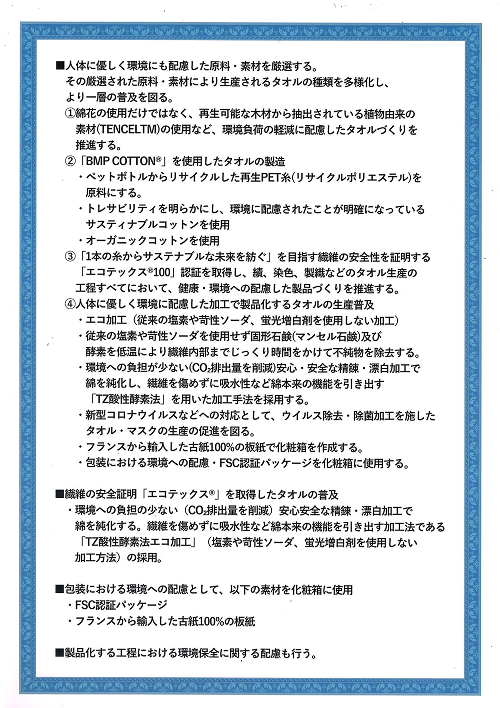 タオル製造過程において人々の健康及び環境に配慮した製品づくりを促進し社会に貢献してまいります。